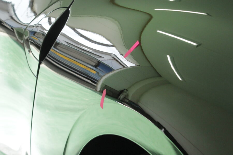 範囲が広い上にヘミング折れ、擦り傷もありましたので鈑金塗装も選択肢になりますが、トータルでデントリペアの方がメリットがありました。